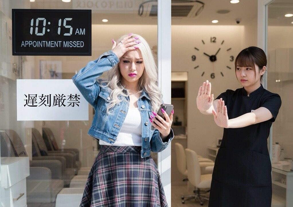 ご予約時間に1分でも遅れた場合は、強制キャンセル扱いとなります。次のお客様のご予約への影響を防ぐため、時間厳守をお願いしたします。目安は5分前くらいのサロン着でお願いします。それ以前の来店も来店中のお客様へのご迷惑になりますので守っていただけますようよろしくお願いします。お車で来店される際、交通渋滞が原因で遅れるや周辺のコインパーキングが空いてないなどで遅れるなどの理由であっても遅刻対応になるので余裕を持った責任ある行動のご協力をお願いします。公共交通機関の遅延で遅れる場合、遅延証明書を提出していただければ、ご請求免除とします。ただ遅延証明書の偽造やあきらかに時間ギリギリの行動で遅延のせいにしてると判断した場合は請求対象となります。